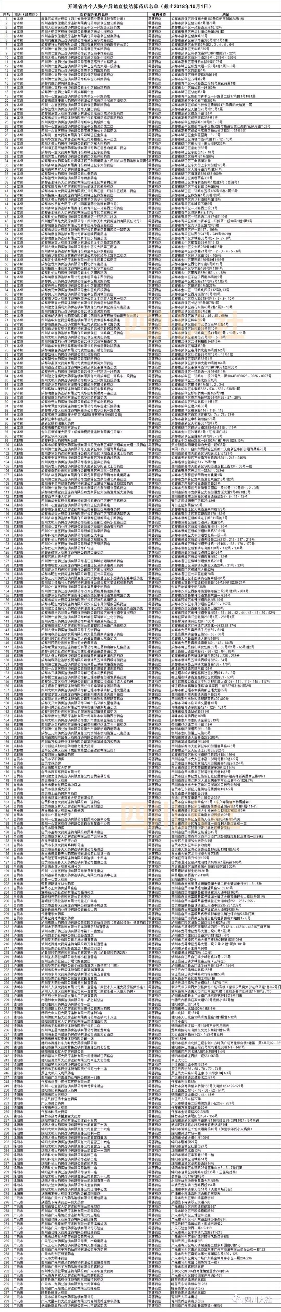 目前全省共开通省内个人账户异地直接结算医院464家、药店1073家(名单附后),开通医药机构信息可通过四川省人力资源和社会保障厅官网(www.sc.hrss.gov.cn)查询。